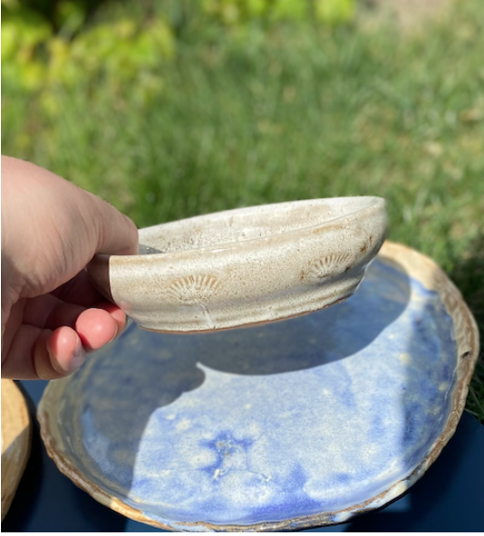 influenced product of a dozen unsuccessful attempts of thrown plates, bowls, mixed glazes; like